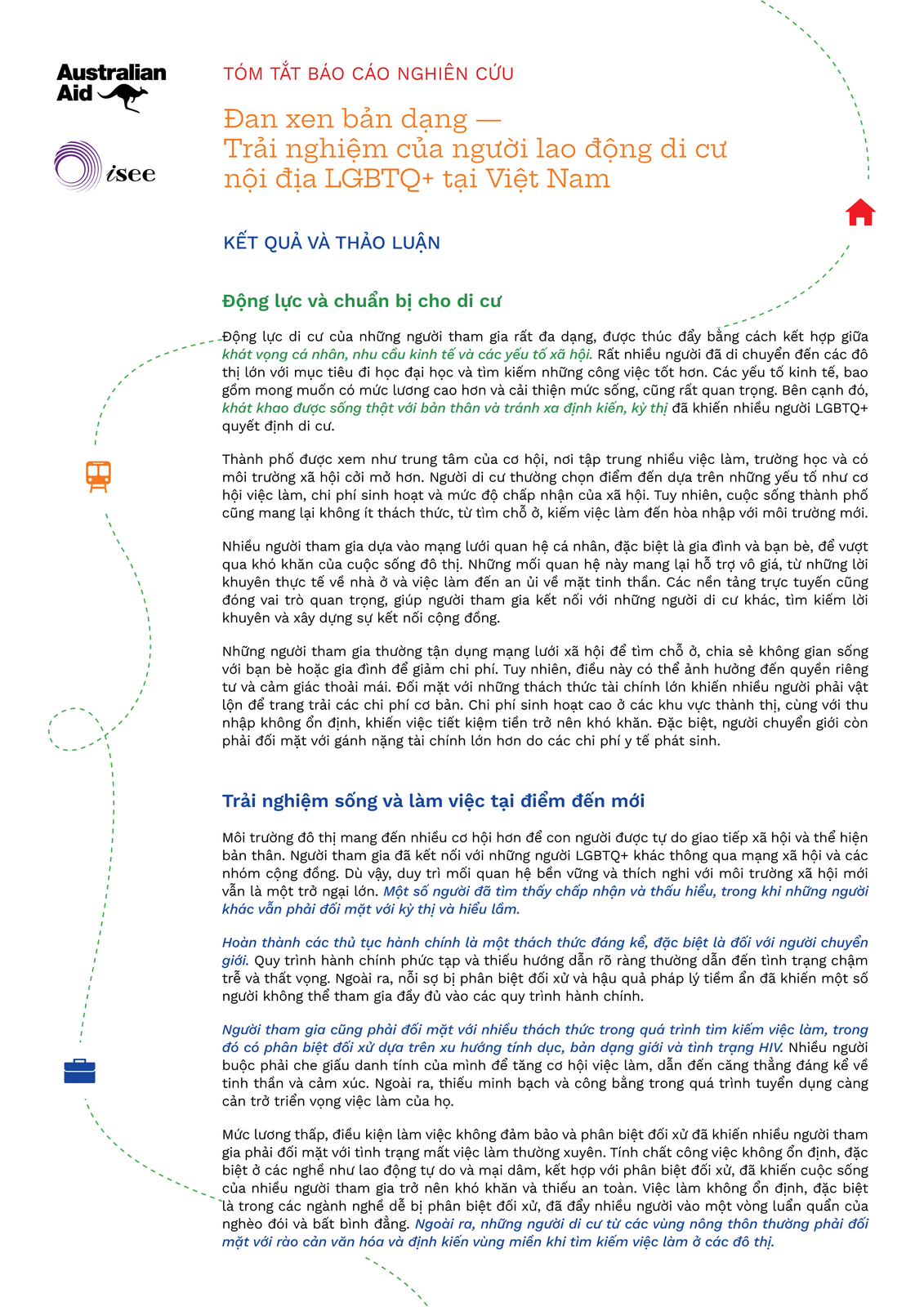Di cư đã và đang là một dòng chảy không ngừng trong lịch sử Việt Nam và còn tiếp diễn trong tương lai. Dù đã có nhiều nghiên cứu chuyên sâu về di cư, những trải nghiệm cụ thể của người LGBTQ+ là lao động di cư trong nước vẫn còn là một khoảng trống lớn trong nghiên cứu. Trong bối cảnh đó, năm 2024, Viện iSEE cùng nhóm nghiên cứu đã thực hiện nghiên cứu định tính nhằm làm rõ hơn trải nghiệm của những người lao động di cư thuộc cộng đồng LGBTQ+, từ đó đề xuất các giải pháp và dịch vụ hỗ trợ phù hợp với nhóm đối tượng này.