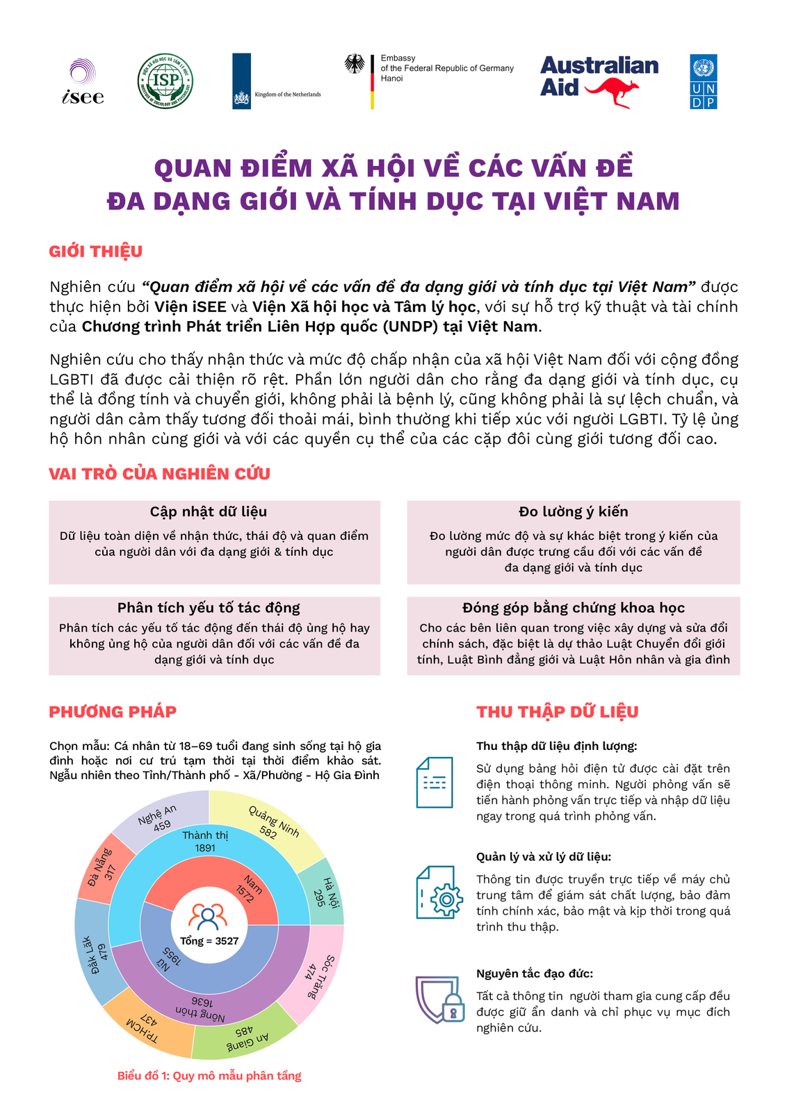 Nghiên cứu “Quan điểm xã hội về các vấn đề đa dạng giới và tính dục tại Việt Nam” được thực hiện bởi Viện iSEE và Viện Xã hội học và Tâm lý học, với sự hỗ trợ kỹ thuật và tài chính của Chương trình Phát triển Liên Hợp quốc (UNDP). Nghiên cứu cho thấy nhận thức và mức độ chấp nhận của xã hội Việt Nam đối với cộng đồng LGBTI đã được cải thiện rõ rệt. Trong đó, nhóm người đồng tính có sự hiện diện cao trong xã hội. Phần lớn người dân cho rằng đa dạng giới và tính dục, cụ thể là đồng tính và chuyển giới, không phải là bệnh lý, cũng không phải là sự lệch chuẩn, và người dân cảm thấy tương đối thoải mái, bình thường khi tiếp xúc với người LGBTI. Tỷ lệ ủng hộ hôn nhân cùng giới và với các quyền cụ thể của các cặp đôi cùng giới tương đối cao.